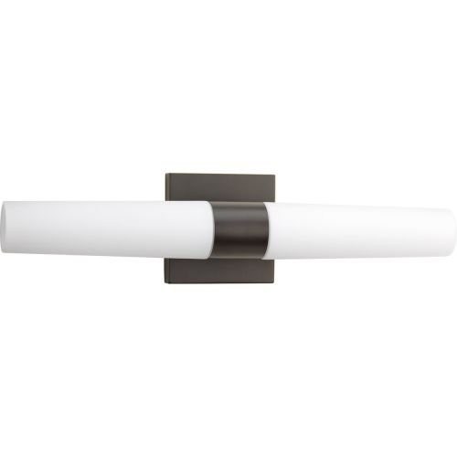 Simple, sleek 2-light vanity with white etched glass. Steel construction available in Bronze, Black, or Brushed Nickel finishes. Damp location rated.