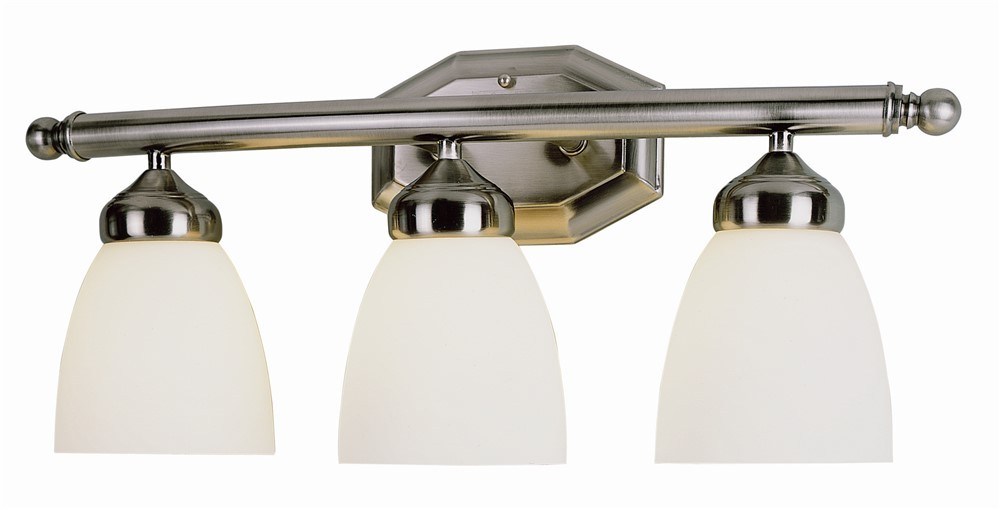 Simple, attractive, sleek 2-light vanity fixture. Features white frosted glass and steel construction in Brushed Nickel or Polished Chrome finish.