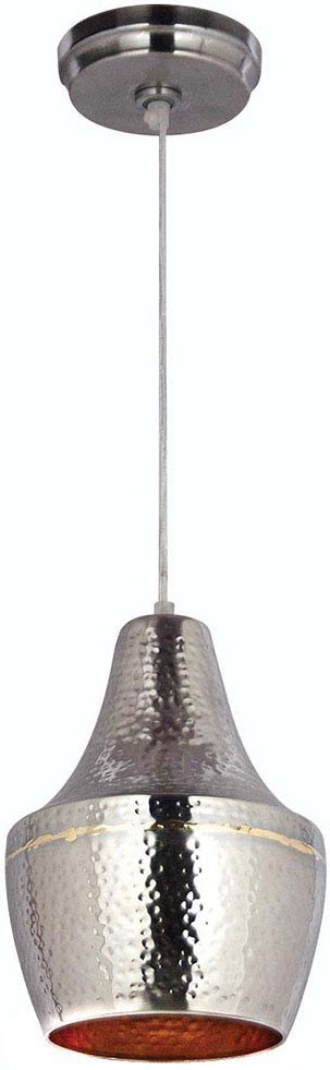 This modern pendant has a hammered nickel plate finish for a custom look and an elegant brass inner finish.