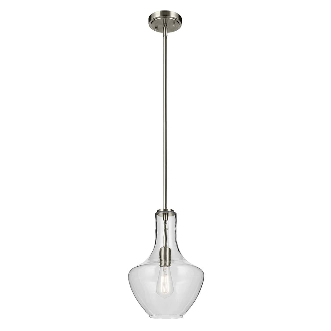 A modern, attractive, stem-mounted pendant with clean lines and simple elegance. This steel fixture features clear seeded glass.