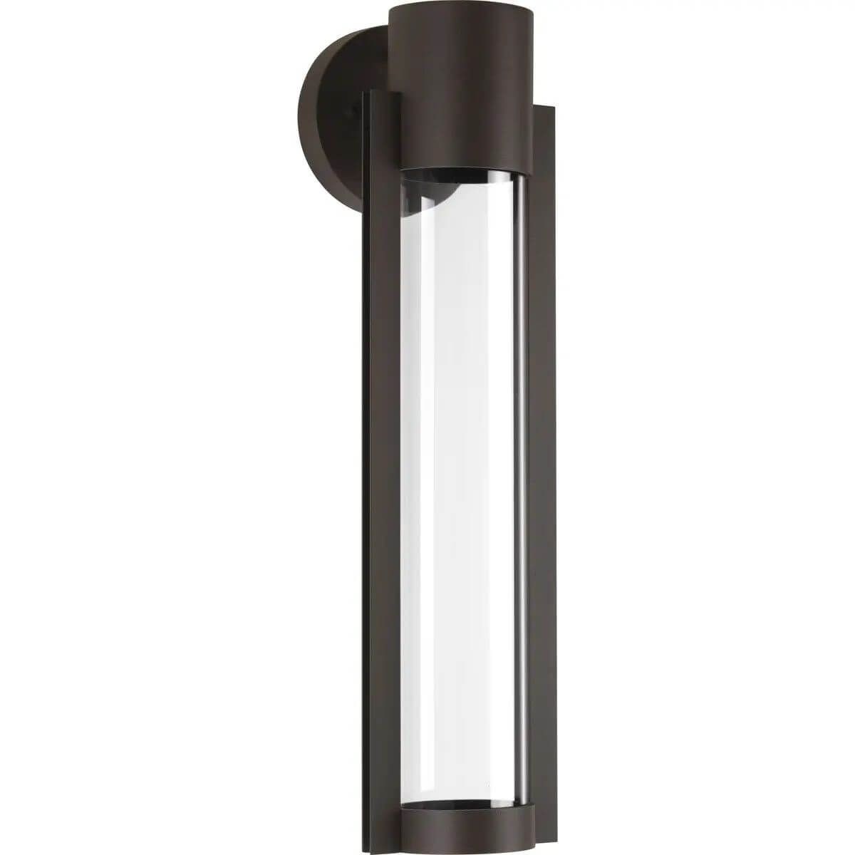 An attractive, sleek outdoor wall sconce featuring an antique bronze powder-coated finish and clear seeded glass. Made from aluminum construction.