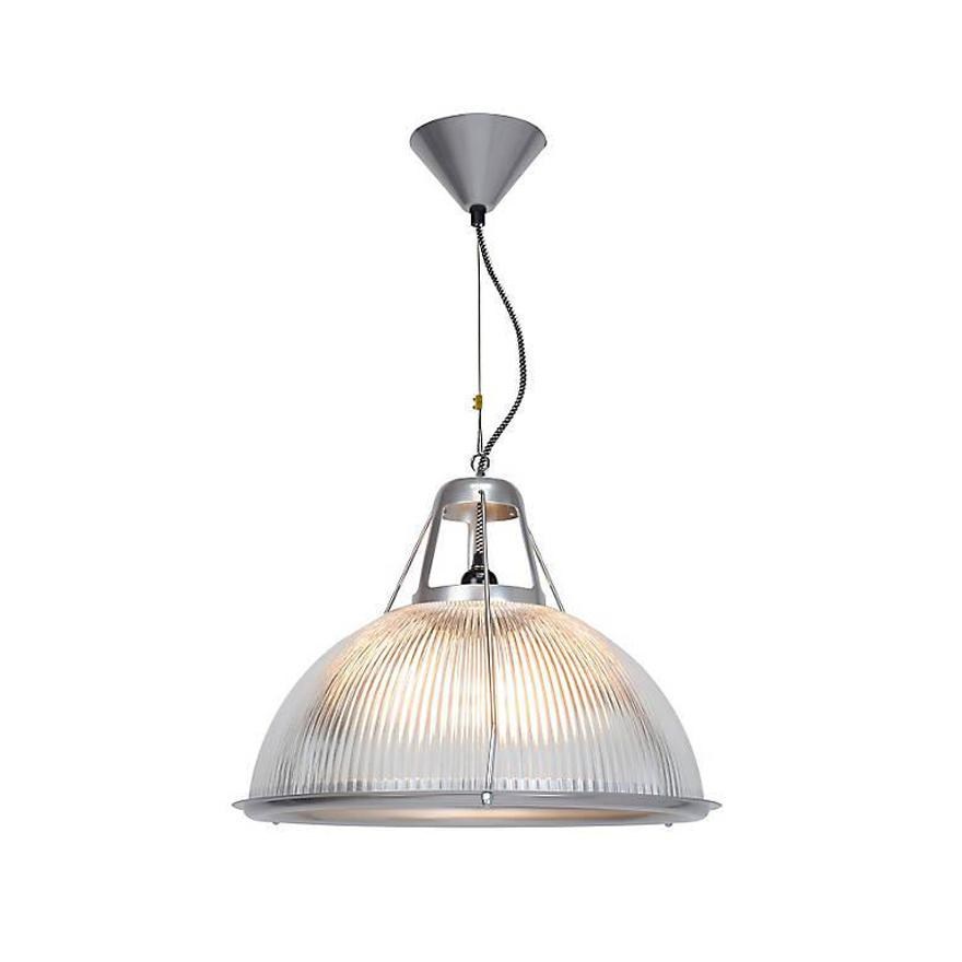 This modern, attractive pendant has a ribbed glass effect for a custom look. It features brushed nickel finish accents and includes a mounting cord.